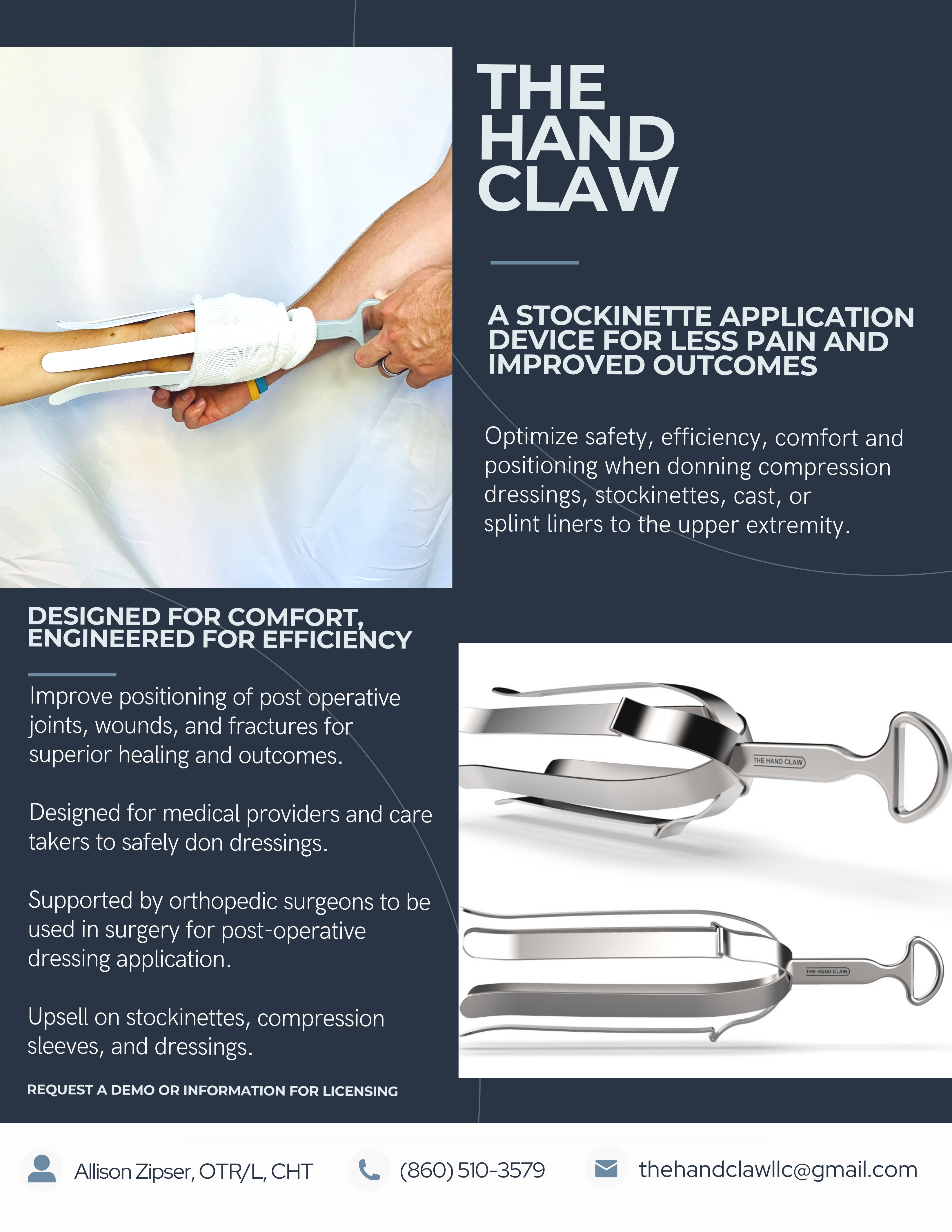 The Hand Claw is a fully patented medical device that revolutionizes the process of applying stockinettes and compression materials.